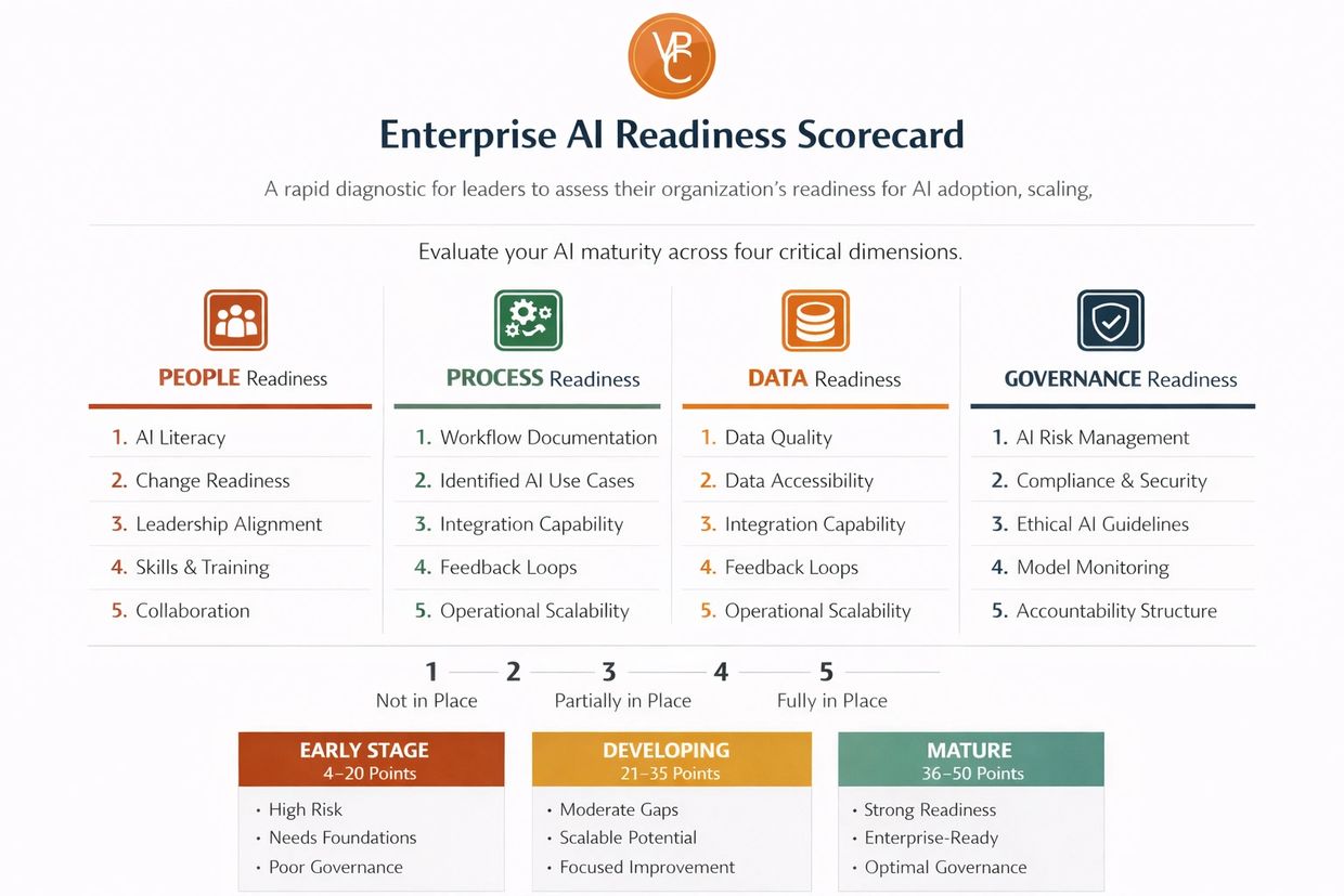 If you’re a senior leader, transformation owner, or AI sponsor, this scorecard is designed for you. Use it with your executive team, your AI task force, or as a pre-work diagnostic before an AI Enablement engagement with VinPro.